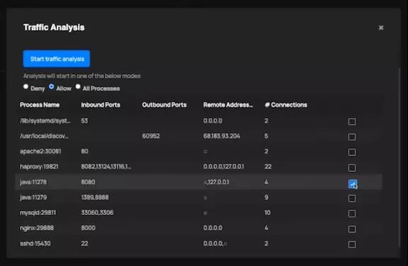 攻击指标:通过深度捕获数据包,它能够发现各种嗅探、横向传播、命令和控制(command-and-control)、渗透、以及其他攻击活动。危害指标:通过在主机上捕获进程和文件系统的异常,它能够发现攻击者是否已成功地利用了那些易受攻击的组件。由于 ThreatStryker 的数据包捕获(https://deepfence.io/deep-packet-inspection/)功能运行在后台,因此它可以对来自所有节点和容器的流量,进行静默式采样。出于本演示的目的,我手动启动数据包的捕获功能,并选择需要监控的特定进程: