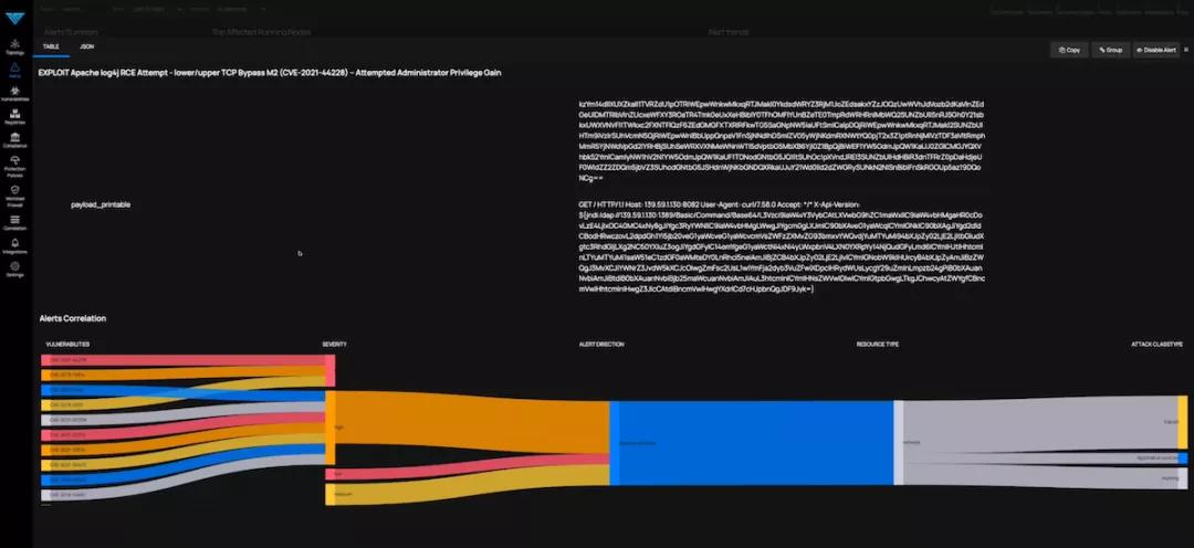 ThreatStryker 使用网络杀伤链(Cyber Kill Chain)框架(https://www2.deloitte.com/content/dam/Deloitte/sg/Documents/risk/sea-risk-cyber-101-july2017.pdf)的扩展版本,来模拟攻击行为。在意图阶段(Intent Stage),它会将事件映射到网络杀伤链中,并以上下文的方式,提供攻击类型和严重程度。您只需单击下半部分列表中的某个警报,就能够看到各种深入的详细信息。例如,下图是我在单击了尝试获取管理员权限警报后,所看到的内容。下半部分有一个桑基图(Sankey Diagram)。该图显示了恶意活动随着时间变化,而推进的情况。这方便了您开展追踪,应用策略,以及获悉正在发生的攻击。而上半部分则包括了表格和 JSON 视图。它收录了各种触发警报的详细信息,您可以上下滚动,以查看包括数据包的有效负载、以及违规字符串等大量的表述信息。如图所示,我停留在了臭名昭著的 ${jndi:ldap 字符串处,它便是 Log4j2 攻击的签名。