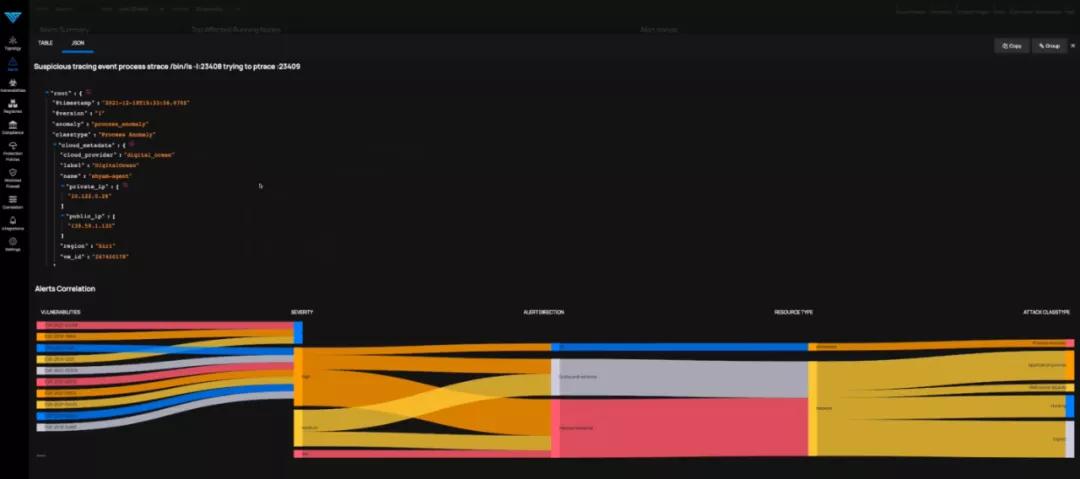 让我们来查看另一个警报 --Suspicious tracing event process strace /bin/ls -l:23408 trying to ptrace:23409。它是在主机检查中产生的,即:一个进程正在尝试着执行系统追踪。这是在正常操作中并不常见的事件,它指示了攻击者已经找到了破坏容器或应用程序的方法。