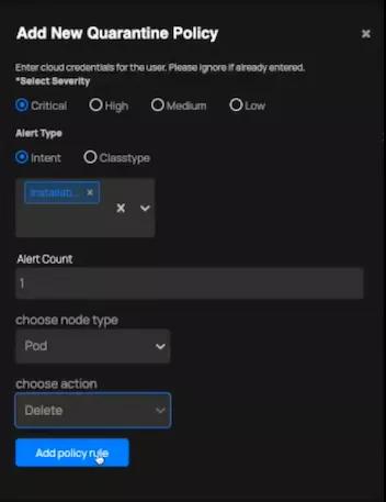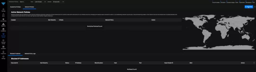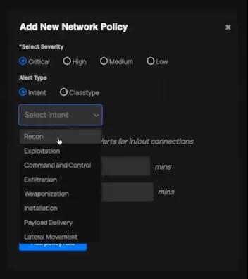 您可能已经注意到了,在该演示环境中,我们尚未创建或设置任何保护策略。为此,请单击网络策略(Network Policies)选项卡,然后单击右上角的添加策略(Add Policy)按钮。您将看到一个选项菜单,并可以在其中选择严重性、警报类型、意图类型等。