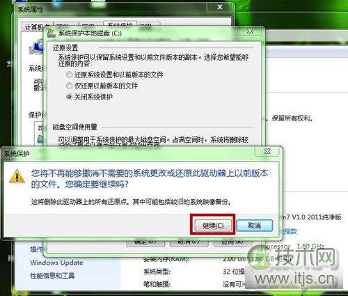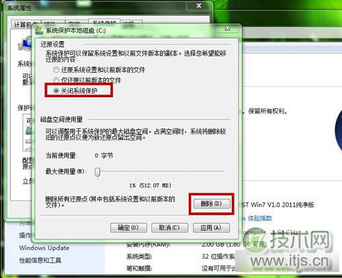 第四步、在弹出的“系统保护本地磁盘”窗口中,我们把“还原设置”改为“关闭系统保护”,再单击“删除”。