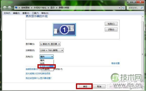 第二步、教切 在“屏幕分辨率”窗口中,显示向像选定“方向”标签,屏方选择“横向(翻转)”。当然,你也可以根据你的习惯,IT技术网调整方向。然后,你再点击“应用”最后“确定”,就可以了。