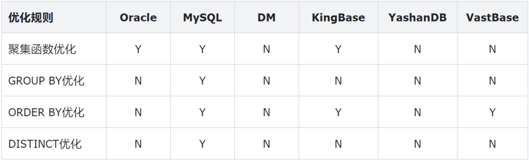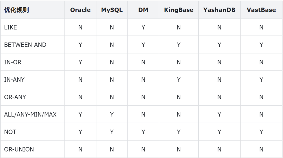 复制-- Oracle-- Like(未改写)SQL> select * from emp where emp_name like emp12%;--------------------------------------------------------------------------| Id | Operation | Name | Rows | Bytes | Cost (%CPU)| Time |--------------------------------------------------------------------------| 0 | SELECT STATEMENT | | 118 | 3304 | 15 (0)| 00:00:01 ||* 1 | TABLE ACCESS FULL| EMP | 118 | 3304 | 15 (0)| 00:00:01 |--------------------------------------------------------------------------Predicate Information (identified by operation id):--------------------------------------------------- 1 - filter("EMP_NAME" LIKE emp12%) -- Between And(改写)SQL> select * from emp where salary between 1000 and 1200;--------------------------------------------------------------------------| Id | Operation | Name | Rows | Bytes | Cost (%CPU)| Time |--------------------------------------------------------------------------| 0 | SELECT STATEMENT | | 1799 | 50372 | 15 (0)| 00:00:01 ||* 1 | TABLE ACCESS FULL| EMP | 1799 | 50372 | 15 (0)| 00:00:01 |--------------------------------------------------------------------------Predicate Information (identified by operation id):--------------------------------------------------- 1 - filter("SALARY"<=1200 AND "SALARY">=1000) -- IN-OR/IN-ANY(改写)SQL> select * from emp where dept_id in (20,30);--------------------------------------------------------------------------| Id | Operation | Name | Rows | Bytes | Cost (%CPU)| Time |--------------------------------------------------------------------------| 0 | SELECT STATEMENT | | 189 | 5292 | 15 (0)| 00:00:01 ||* 1 | TABLE ACCESS FULL| EMP | 189 | 5292 | 15 (0)| 00:00:01 |--------------------------------------------------------------------------Predicate Information (identified by operation id):--------------------------------------------------- 1 - filter("DEPT_ID"=20 OR "DEPT_ID"=30) -- OR-ANY(未改写)SQL> select * from emp where dept_id=20 or dept_id=30;--------------------------------------------------------------------------| Id | Operation | Name | Rows | Bytes | Cost (%CPU)| Time |--------------------------------------------------------------------------| 0 | SELECT STATEMENT | | 189 | 5292 | 15 (0)| 00:00:01 ||* 1 | TABLE ACCESS FULL| EMP | 189 | 5292 | 15 (0)| 00:00:01 |--------------------------------------------------------------------------Predicate Information (identified by operation id):--------------------------------------------------- 1 - filter("DEPT_ID"=20 OR "DEPT_ID"=30) --ALL/ANY-MIN/MAX(改写)SQL> SELECT * FROM emp WHERE salary > ANY ( SELECT salary FROM emp WHERE dept_id=20);----------------------------------------------------------------------------| Id | Operation | Name | Rows | Bytes | Cost (%CPU)| Time |----------------------------------------------------------------------------| 0 | SELECT STATEMENT | | 8999 | 325K| 32 (7)| 00:00:01 || 1 | MERGE JOIN SEMI | | 8999 | 325K| 32 (7)| 00:00:01 || 2 | SORT JOIN | | 10000 | 273K| 16 (7)| 00:00:01 || 3 | TABLE ACCESS FULL| EMP | 10000 | 273K| 15 (0)| 00:00:01 ||* 4 | SORT UNIQUE | | 101 | 909 | 16 (7)| 00:00:01 ||* 5 | TABLE ACCESS FULL| EMP | 101 | 909 | 15 (0)| 00:00:01 |----------------------------------------------------------------------------Predicate Information (identified by operation id):--------------------------------------------------- 4 - access(INTERNAL_FUNCTION("SALARY")>INTERNAL_FUNCTION("SALARY")) filter(INTERNAL_FUNCTION("SALARY")>INTERNAL_FUNCTION("SALARY")) 5 - filter("DEPT_ID"=20)-- NOT(改写)SQL> select * from emp where not dept_id!=20;--------------------------------------------------------------------------| Id | Operation | Name | Rows | Bytes | Cost (%CPU)| Time |--------------------------------------------------------------------------| 0 | SELECT STATEMENT | | 101 | 2828 | 15 (0)| 00:00:01 ||* 1 | TABLE ACCESS FULL| EMP | 101 | 2828 | 15 (0)| 00:00:01 |--------------------------------------------------------------------------Predicate Information (identified by operation id):--------------------------------------------------- 1 - filter("DEPT_ID"=20)-- OR-UNION(未改写)SQL> select * from emp where dept_id=1 or dept_id=2;--------------------------------------------------------------------------| Id | Operation | Name | Rows | Bytes | Cost (%CPU)| Time |--------------------------------------------------------------------------| 0 | SELECT STATEMENT | | 141 | 3948 | 15 (0)| 00:00:01 ||* 1 | TABLE ACCESS FULL| EMP | 141 | 3948 | 15 (0)| 00:00:01 |--------------------------------------------------------------------------Predicate Information (identified by operation id):--------------------------------------------------- 1 - filter("DEPT_ID"=1 OR "DEPT_ID"=2) -- DM-- Like(改写)SQL> explain select * from emp where emp_name like emp12%;1 #NSET2: [1, 111, 163]2 #PRJT2: [1, 111, 163]; exp_num(6), is_atom(FALSE)3 #BLKUP2: [1, 111, 163]; IDX_EMP_NAME(EMP)4 #SSEK2: [1, 111, 163]; scan_type(ASC), IDX_EMP_NAME(EMP), scan_range[emp12,emp13), is_global(0) -- Between And(改写)SQL> explain select * from emp where salary between 1000 and 1200;1 #NSET2: [1, 1762, 163]2 #PRJT2: [1, 1762, 163]; exp_num(6), is_atom(FALSE)3 #SLCT2: [1, 1762, 163]; (EMP.SALARY >= var1 AND EMP.SALARY <= var2) SLCT_PUSHDOWN(TRUE)4 #CSCN2: [1, 10000, 163]; INDEX33555484(EMP) NEED_SLCT(TRUE); btr_scan(1) -- IN-OR/IN-ANY(不改写)SQL> explain select * from emp where dept_id in (20,30);1 #NSET2: [3, 500, 193]2 #PRJT2: [3, 500, 193]; exp_num(6), is_atom(FALSE)3 #HASH2 INNER JOIN: [3, 500, 193]; KEY_NUM(1); KEY(DMTEMPVIEW_889193477.colname=EMP.DEPT_ID) KEY_NULL_EQU(0)4 #CONST VALUE LIST: [1, 2, 30]; row_num(2), col_num(1)5 #CSCN2: [1, 10000, 163]; INDEX33555484(EMP); btr_scan(1) -- OR-ANY(未改写)SQL> explain select * from emp where dept_id=20 or dept_id=30;1 #NSET2: [3, 500, 193]2 #PRJT2: [3, 500, 193]; exp_num(6), is_atom(FALSE)3 #HASH2 INNER JOIN: [3, 500, 193]; KEY_NUM(1); KEY(DMTEMPVIEW_889193481.colname=EMP.DEPT_ID) KEY_NULL_EQU(0)4 #CONST VALUE LIST: [1, 2