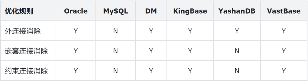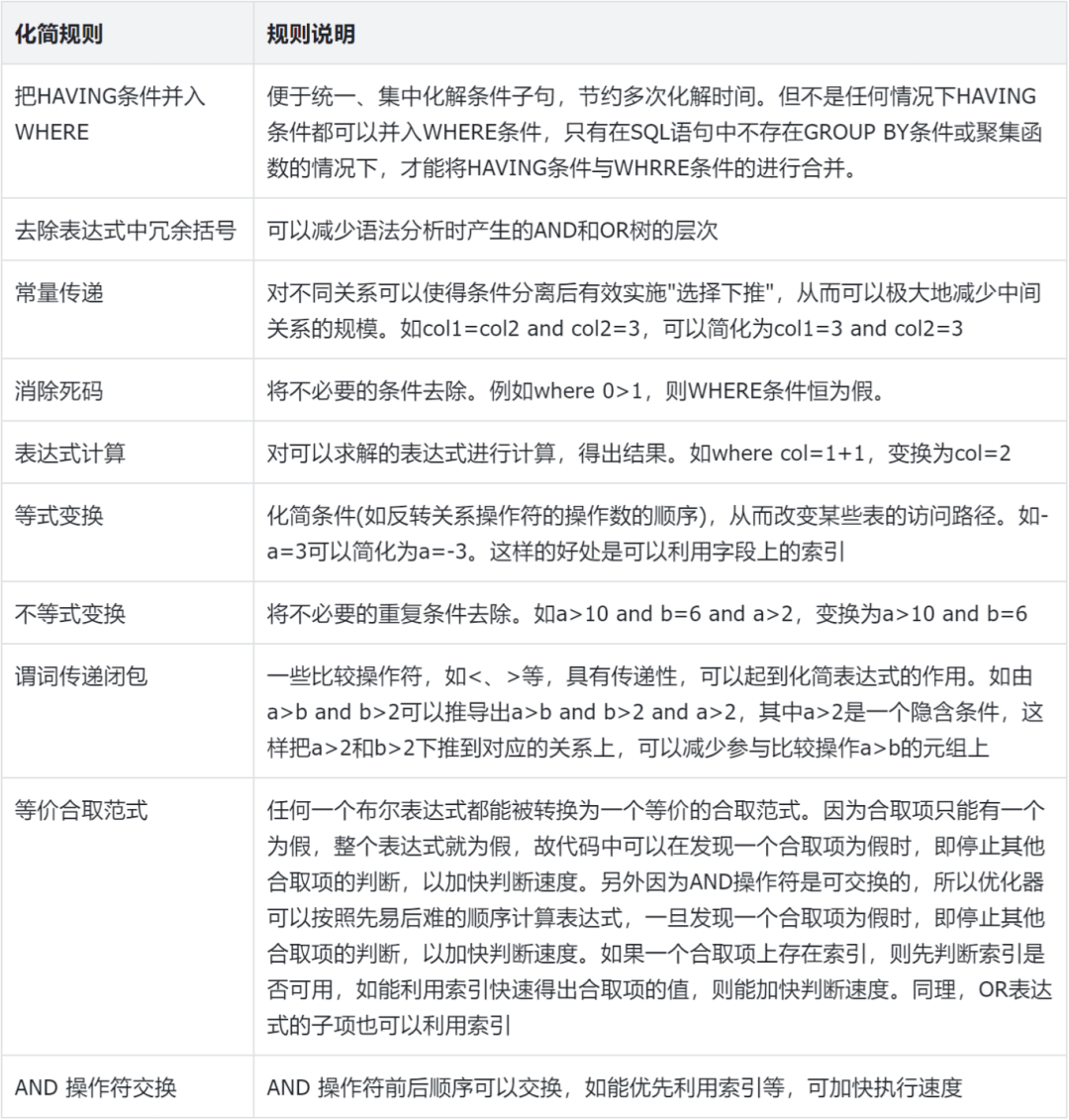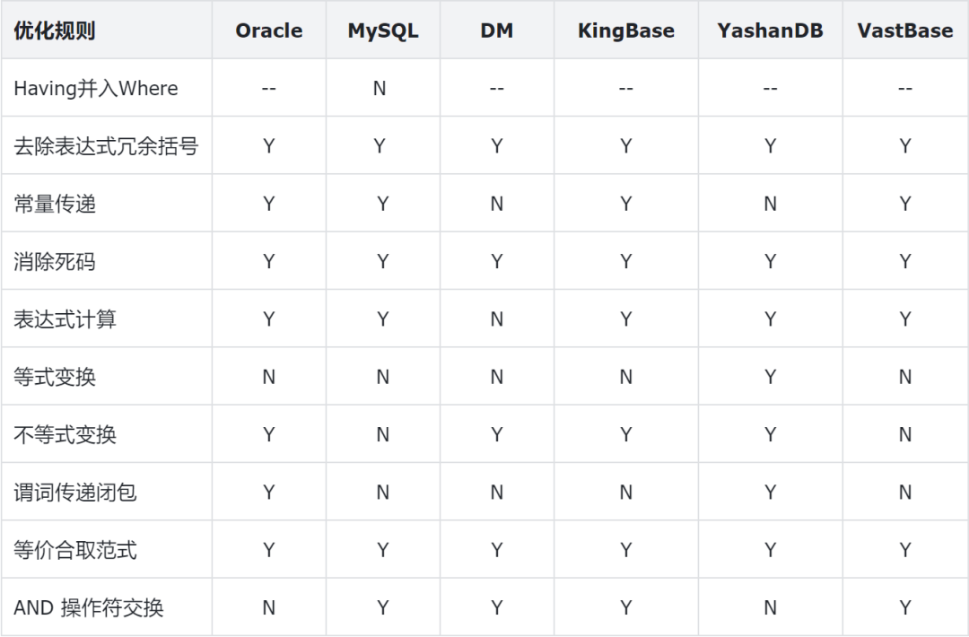 复制-- Oracle-- Having 并入 Where(不支持)SQL> SELECT * FROM emp where dept_id=100 HAVING salary > 5000;SELECT * FROM emp where dept_id=100 HAVING salary > 5000 *ERROR at line 1:ORA-00979: not a GROUP BY expression--去除冗余括号SQL> SELECT * FROM emp WHERE ((dept_id=2));--------------------------------------------------------------------------| Id | Operation | Name | Rows | Bytes | Cost (%CPU)| Time |--------------------------------------------------------------------------| 0 | SELECT STATEMENT | | 102 | 2856 | 15 (0)| 00:00:01 ||* 1 | TABLE ACCESS FULL| EMP | 102 | 2856 | 15 (0)| 00:00:01 |--------------------------------------------------------------------------Predicate Information (identified by operation id):--------------------------------------------------- 1 - filter("DEPT_ID"=2) -- 常量传递(支持)SQL> select * from emp where dept_id=10 and emp_id=dept_id;--------------------------------------------------------------------------------------| Id | Operation | Name | Rows | Bytes | Cost (%CPU)| Time |--------------------------------------------------------------------------------------| 0 | SELECT STATEMENT | | 1 | 28 | 2 (0)| 00:00:01 ||* 1 | TABLE ACCESS BY INDEX ROWID| EMP | 1 | 28 | 2 (0)| 00:00:01 ||* 2 | INDEX UNIQUE SCAN | EMP_PK | 1 | | 1 (0)| 00:00:01 |--------------------------------------------------------------------------------------Predicate Information (identified by operation id):--------------------------------------------------- 1 - filter("DEPT_ID"=10) 2 - access("EMP_ID"=10) -- 消除死码(支持)SQL> select * from emp where (0>1) or dept_id=10;--------------------------------------------------------------------------| Id | Operation | Name | Rows | Bytes | Cost (%CPU)| Time |--------------------------------------------------------------------------| 0 | SELECT STATEMENT | | 98 | 2744 | 15 (0)| 00:00:01 ||* 1 | TABLE ACCESS FULL| EMP | 98 | 2744 | 15 (0)| 00:00:01 |--------------------------------------------------------------------------Predicate Information (identified by operation id):--------------------------------------------------- 1 - filter("DEPT_ID"=10) -- 表达式计算(支持)SQL> select * from emp where dept_id=1+2;--------------------------------------------------------------------------| Id | Operation | Name | Rows | Bytes | Cost (%CPU)| Time |--------------------------------------------------------------------------| 0 | SELECT STATEMENT | | 107 | 2996 | 15 (0)| 00:00:01 ||* 1 | TABLE ACCESS FULL| EMP | 107 | 2996 | 15 (0)| 00:00:01 |--------------------------------------------------------------------------Predicate Information (identified by operation id):--------------------------------------------------- 1 - filter("DEPT_ID"=3) -- 等式变换(不支持)SQL> select * from emp where -dept_id=-10;--------------------------------------------------------------------------| Id | Operation | Name | Rows | Bytes | Cost (%CPU)| Time |--------------------------------------------------------------------------| 0 | SELECT STATEMENT | | 100 | 2800 | 15 (0)| 00:00:01 ||* 1 | TABLE ACCESS FULL| EMP | 100 | 2800 | 15 (0)| 00:00:01 |--------------------------------------------------------------------------Predicate Information (identified by operation id):--------------------------------------------------- 1 - filter((-"DEPT_ID")=(-10)) -- 不等式转换(支持)SQL> select * from emp where salary >1100 and salary>2000;----------------------------------------------------------------------------------------------| Id | Operation | Name | Rows | Bytes | Cost (%CPU)| Time |----------------------------------------------------------------------------------------------| 0 | SELECT STATEMENT | | 1 | 28 | 4 (0)| 00:00:01 || 1 | TABLE ACCESS BY INDEX ROWID| EMP | 1 | 28 | 4 (0)| 00:00:01 ||* 2 | INDEX RANGE SCAN | IDX_EMP_SALARY | 1 | | 2 (0)| 00:00:01 |----------------------------------------------------------------------------------------------Predicate Information (identified by operation id):--------------------------------------------------- 2 - access("SALARY">2000) --谓词传递闭包(支持)SQL> select * from emp where emp_id>dept_id and dept_id>900;----------------------------------------------------------------------------------------------| Id | Operation | Name | Rows | Bytes | Cost (%CPU)| Time |----------------------------------------------------------------------------------------------| 0 | SELECT STATEMENT | | 1 | 28 | 3 (0)| 00:00:01 ||* 1 | TABLE ACCESS BY INDEX ROWID| EMP | 1 | 28 | 3 (0)| 00:00:01 ||* 2 | INDEX RANGE SCAN | IDX_EMP_DEPTID | 1 | | 2 (0)| 00:00:01 |----------------------------------------------------------------------------------------------Predicate Information (identified by operation id):--------------------------------------------------- 1 - filter("EMP_ID">900 AND "EMP_ID">"DEPT_ID") 2 - access("DEPT_ID">900) -- 等价合取范式(支持)SQL> select * from emp where (0>1) and dept_id=10;---------------------------------------------------------------------------| Id | Operation | Name | Rows | Bytes | Cost (%CPU)| Time |---------------------------------------------------------------------------| 0 | SELECT STATEMENT | | 1 | 28 | 0 (0)| ||* 1 | FILTER | | | | | ||* 2 | TABLE ACCESS FULL| EMP | 98 | 2744 | 15 (0)| 00:00:01 |---------------------------------------------------------------------------Predicate Information (identified by operation id):--------------------------------------------------- 1 - filter(NULL IS NOT NULL) 2 - filter("DEPT_ID"=10) -- AND 操作符交换(不支持)SQL> select * from emp where dept_id+emp_id=1000 and salary>900;--------------------------------------------------------------------------| Id | Operation | Name | Rows | Bytes | Cost (%CPU)| Time |--------------------------------------------------------------------------| 0 | SELECT STATEMENT | | 90 | 2520 | 15 (0)| 00:00:01 ||* 1 | TABLE ACCESS FULL| EMP | 90 | 2520 | 15 (0)| 00:00:01 |-----------------------------------------
