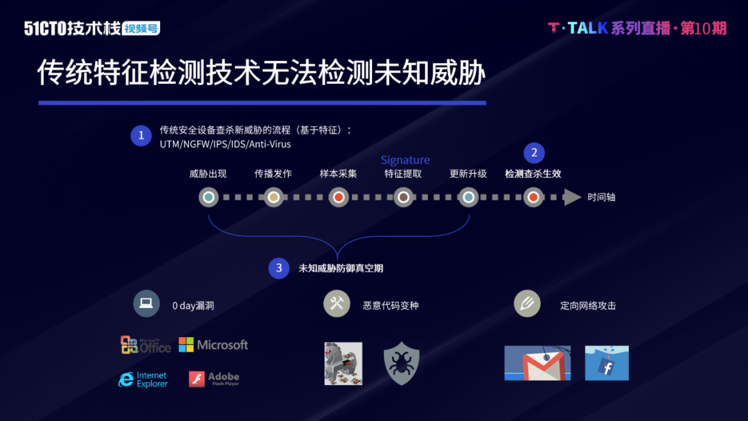 在高级持续性威胁的攻击过程中,需要对攻击手段进行检测和发现,以便对其进行响应和处置。但目前传统的特征检测技术,并没有办法很好地应对其中的高级攻击。传统的攻防手段对抗过程,通常是在一个新的威胁产生后,防守方要想办法获得样本,再基于样本对其进行特征分析并识别威胁,最后更新到可以对威胁进行防御或检测的网络安全设备中,升级后具备检测能力。