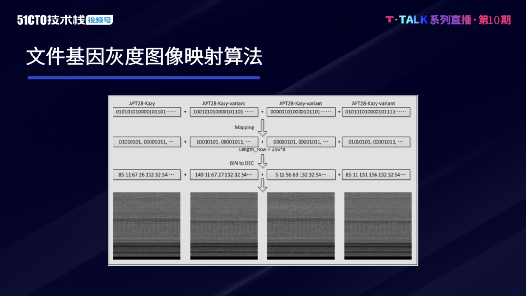第二类问题,高级威胁其中一种是恶意文件的变种,其变化速度很快。传统的特征码很难跟得上样本新变种的产生速度。对此,可以将文件转化成图像,并通过卷积神经网络对图像的识别能力来对文件本身进行间接识别。相比于传统的特征检测算法,使用卷积神经网络对图像识别,它的计算复杂性并没有那么高。