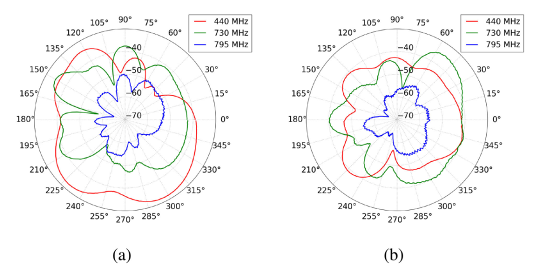 图2 计算机视频泄漏信号的辐射方向图。图(a)为水平极化图,图(b)为垂直极化图