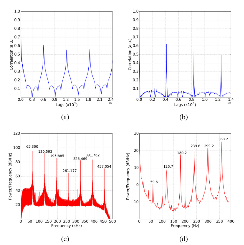 图3 730MHz下计算机视频泄漏信号的功率谱密度图和自相关图。(a)采样率为4Msps时的线频率相关图 (b)采样率为25kSps时图像频率的相关图 (c)线路频率的PSD图 (d)图像频率的PSD图