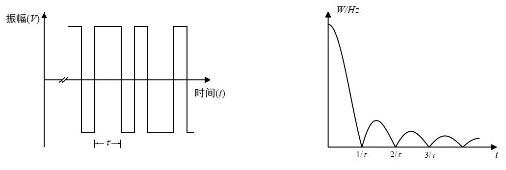基带信号根据类型可分为模拟基带信号和数字基带信号。VGA协议传输模拟基带信号,其中RGB通道通过模拟信号传递亮度信息。在规定的像素周期内,信号幅值的变化用以表示R、G或B像素的亮度值。而DVI、HDMI以及DisplayPort(DP)协议则使用数字基带信号,其通过编码的二进制“0”和“1”表示图像亮度信息,同样在规定的像素周期内完成信号传递。从频谱特性看,基带信号的泄漏频谱可表示为信号本身频谱与发射器件频率响应的乘积。下图展示了一典型数字信号及其功率谱的特性。