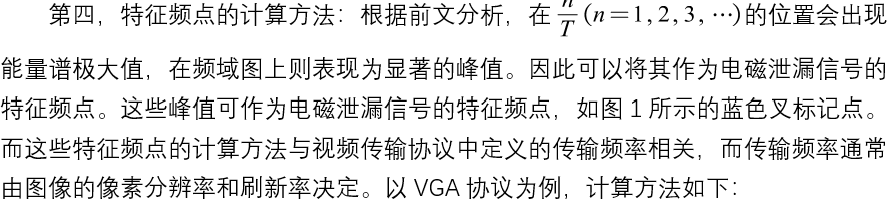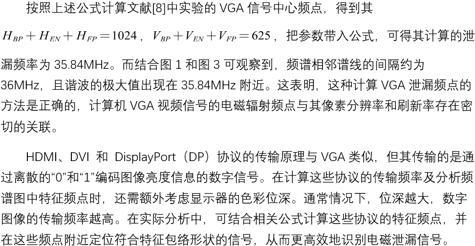 第五,电磁泄漏信号的时域特征:时域特征在电磁辐射泄漏的分析中同样具有重要意义。图4中的信号跳变现象表明,视频泄漏信号与原始RGB信号之间存在显著关联,其中原始RGB信号的跃变沿是图4中正负脉冲信号的主要来源。当图像灰度信息发生剧烈变化时,无论是模拟信号还是数字信号,其幅度都会出现明显的跳变。这些高能量跳变显著提升了泄漏信号被截获和重建的可能性。例如,当图像传输至文字边缘时,其图像显著的灰度跳变会引发更强的泄漏信号跳变,从而使显示文本内容时电磁泄漏信号更容易被捕获并还原。