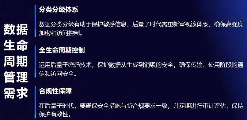 在数据生成和存储阶段,使用后量子加密算法保护数据。在传输和使用阶段,确保通信和访问的安全性。在数据销毁阶段,采取安全的数据擦除和销毁技术,防止数据泄露。