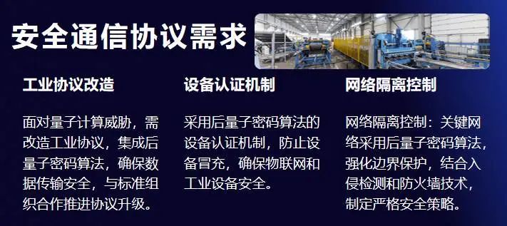 更新现有的工业协议,采用后量子密码算法,实现安全的通信和数据传输。例如,在OPC UA中引入后量子密钥交换和签名算法,确保通信的机密性和完整性。需要与工业标准组织合作,推进协议的升级。