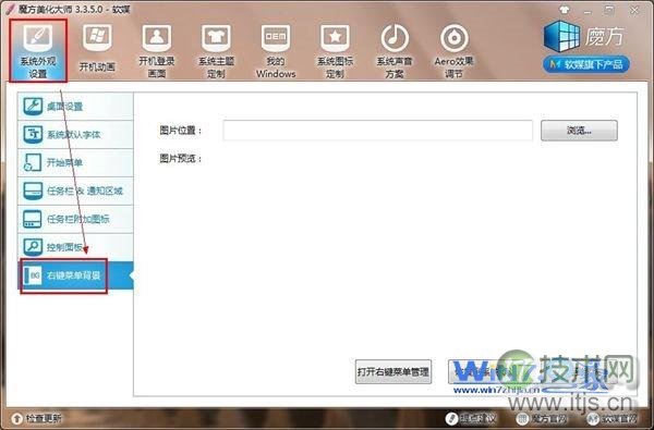3、然后点击浏览选择自己喜欢的右键右键背景图片,然后点击应用到系统按钮。菜单菜单(提示:选择的图片大小应与右键菜单相符,不然就会很容易出现背景图重叠或显示不全等问题哦)