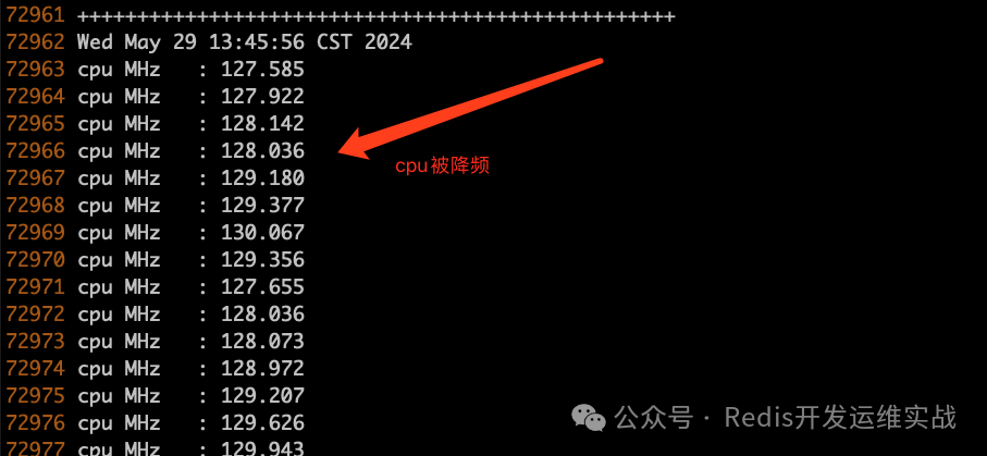 添加了CPU主频秒级监控:发现一瞬间降频(从2800MHz 降低到了 120 MHz)时间点和Redis慢查询时间点一致。