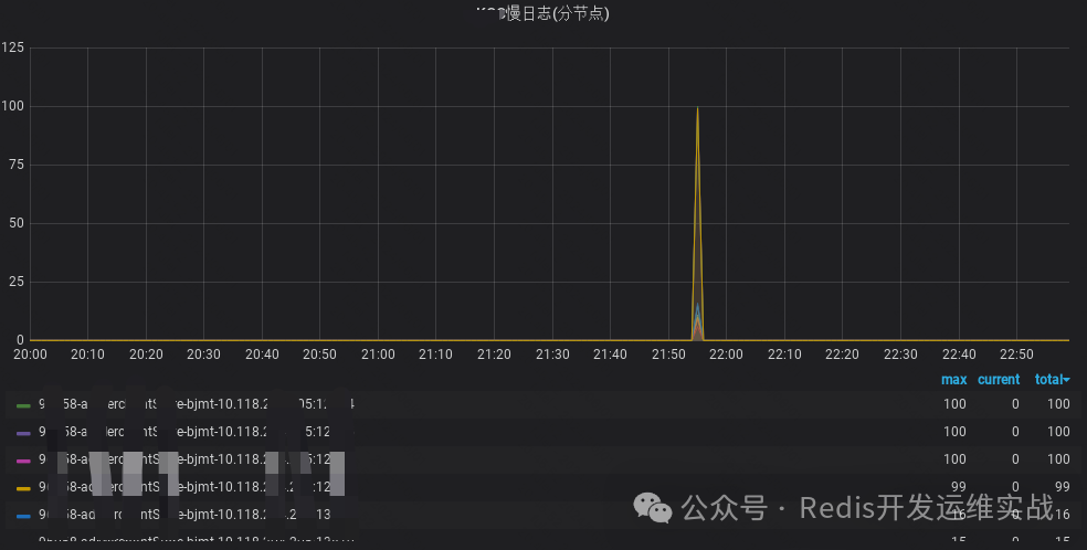 某周末晚上,某业务在21:55可用性突然报警,从100%->98%,经排查该分钟该集群的全部实例出现慢日志(均为小命令),并且集中在一台机器。