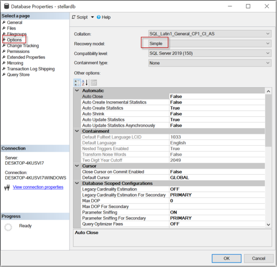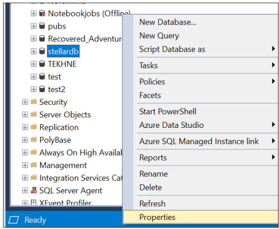 单击“数据库”,右键单击该数据库,然后选择“属性”。