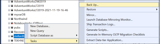 在“对象资源管理器”中右键单击“数据库”,选择“任务>备份”。