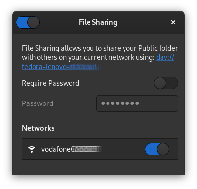 打开 “文件共享file sharing”,“网络Networks” 和 “需要的密码Required password”,允许你使用 WebDAV 协议在你的本地网络上分享你的公共文件夹给其它的工作站。