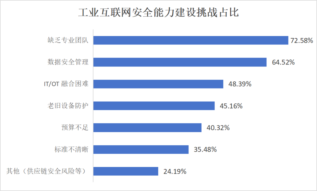 除了在安全技术能力、安全管理能力、安全生态能力方面的能力缺口外,当前工业企业还面临一些产业变革带来的能力挑战,主要包括:新技术应用与安全建设的融合挑战,如AI、5G、边缘计算等技术与工业互联网及现有安全技术融合难题;产业互联升级对安全管理与技术协同的挑战,如IT与OT融合、产业链数据协同问题;存量OT系统安全改造与兼容性挑战、数据要素化背景下的数据安全与隐私保护挑战、安全投入产出衡量及预算获取困难、跨部门协作障碍与责任界定不清、组织运营模式升级带来的安全管理挑战等。