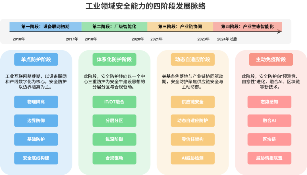 回顾工业互联网从“工业化和信息化的两化融合”到“数字化和智能化的工业互联网重构”的十年发展历程,工业领域安全能力的发展脉络也在进行着次第展开的四个阶段的逐级蜕变:第一阶段,企业聚焦设备联网初期的基础防护,以物理隔离与边界防御构建安全底线;第二阶段,随着厂级智能化推进,IT/OT 融合催生体系化安全需求,分层分区、纵深防御成为主流架构;第三阶段,产业链协同趋势下,供应链安全与动态自适应防护能力成为焦点,零信任、AI 威胁检测等技术加速落地;第四阶段,面向未来产业生态智能化,安全能力正朝着态势感知、主动免疫、预测自愈的方向突破。