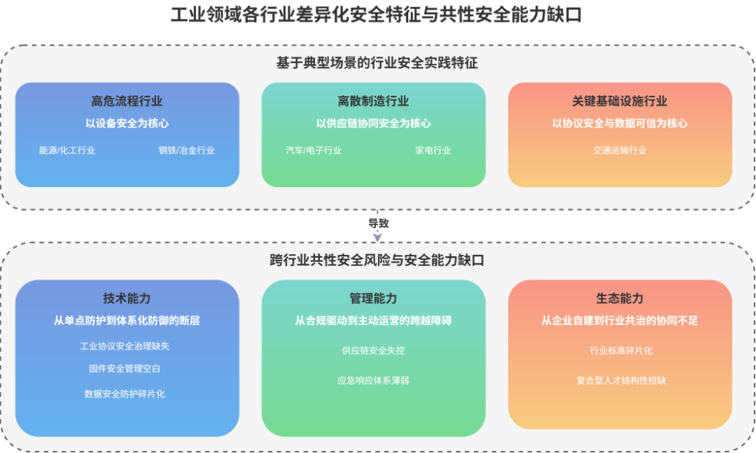 不同工业细分领域因生产流程、设备特性及网络架构差异,面临的安全风险与安全能力缺口呈现显著分化,但同时也存在一定的共性特征。整体来看,各行业基于业务特性正逐步形成安全防护的“局部最优解”(如能源行业协议加密、汽车行业供应链准入),但整体上仍受限于技术碎片化、管理粗放化、生态孤立化等共性瓶颈。未来需以“行业场景需求”为驱动,以“全域能力标准”为支撑,推动工业企业安全能力从“企业级实践”向“行业级基础设施”进化,最终实现“差异化防护有深度、共性风险治理有力度”的工业互联网安全新生态。