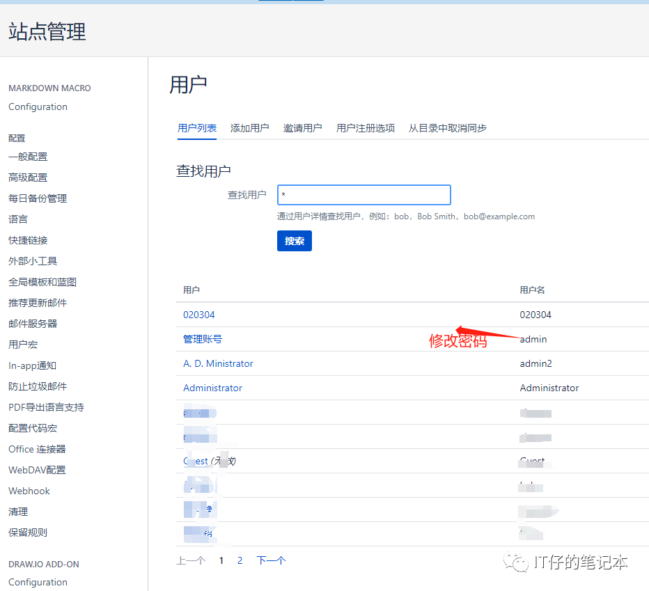 复制insert into cwd_membership (id, parent_id, child_user_id) values (888888, (select id from cwd_group where group_name=confluence-users and directory_id=(select id from cwd_directory where directory_name=Confluence Internal Directory)), 2212121); insert into cwd_membership (id, parent_id, child_user_id) values (999999, (select id from cwd_group where group_name=confluence-administrators and directory_id=(select id from cwd_directory where directory_name=Confluence Internal Directory)), 2212121);1.2.通过以上步骤,即可解决忘记密码的问题,使用新增的管理员账户登录进行用户权限管理即可。