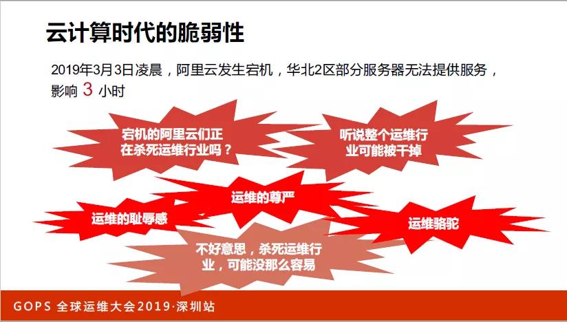 有一些专家说“不好意思,杀死运维行业可能没那么容易”。大家可以看到,云计算服务有脆弱性在里面,运维行业在飞速发展的过程中,脆弱性可能更大。