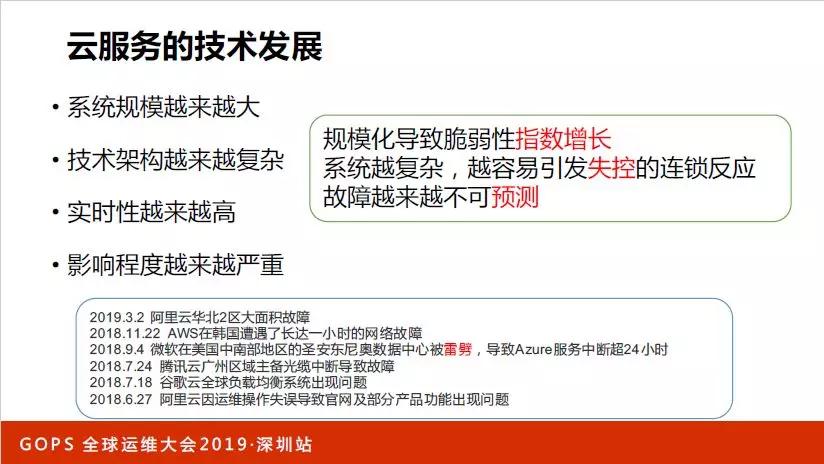 阿里云、AWS、微软、腾讯、谷歌都出现过故障和问题,我们要做的是怎么去应对。规模化会导致脆弱性指数性增长,系统越复杂越容易导致失控的连锁性的反应,我们对故障越来越难以预测,什么时候故障会出现,我们是无法预计的。