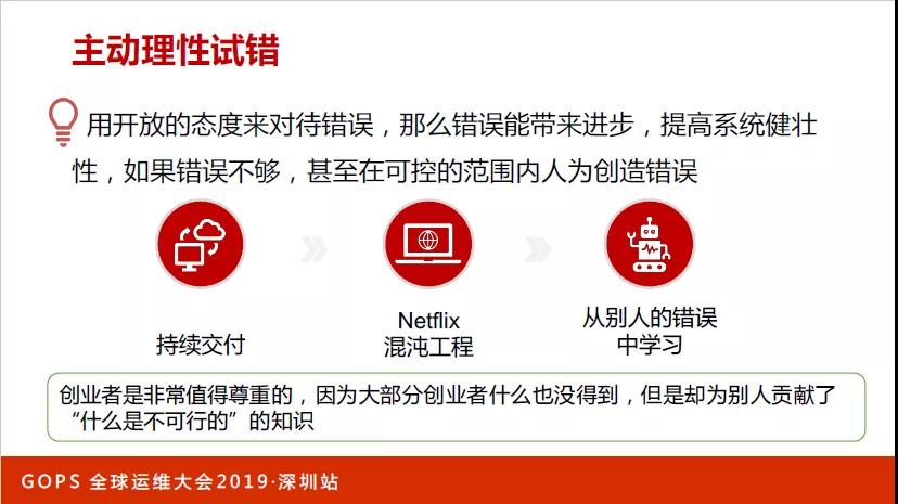 Netflix 混沌工程,系统软件做到没有?做到了。于是假设现在有一只猴子来到了机房当中,猴子到机房中做什么事情?把网线拔了,把电源线拔了,你还能不能做到?试过才知道,当然这个事情是在可控范围内。