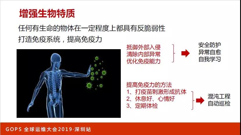 比如我们打疫苗,牛痘是跟天花很像的病毒,但是它对人体的伤害非常小,我们注重牛痘以后会让免疫系统认识天花是病毒,当有天花病毒侵入人体的时候白细胞会把它干掉,所有疫苗都是这种原理,用对身体比较小的错误来对大错误进行防范。对于运维来说,我们要做好防火墙,要做好异常自愈能力。