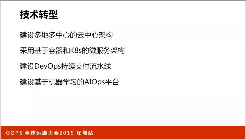 建设多地多中心的云中心架构;采用基于容器和K8s的微服务架构,通过K8s可以提高应用架构的转型;建设 DevOps 持续交付流水线;建设基于机器学习和AlOps的平台。