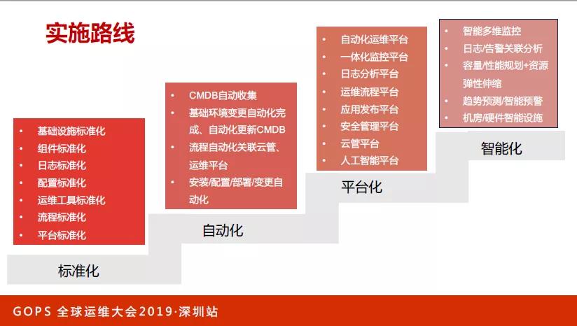 如何实施?将所有配置、基础设施标准化,在此基础上做自动化,自动收集CMDB,自动完成技术环境变更,与流程打通;平台化,对外支持服务,人工智能平台、云管理平台、安全平台,最后实现智能化,实现多维监控、容量预测、趋势预警。