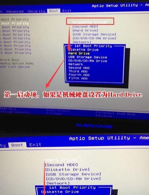 在BIOS界面的"Boot"选项中,找到"BootDevicePriority"或类似选项,选择安装操作系统的设备,如U盘或DVD驱动器。