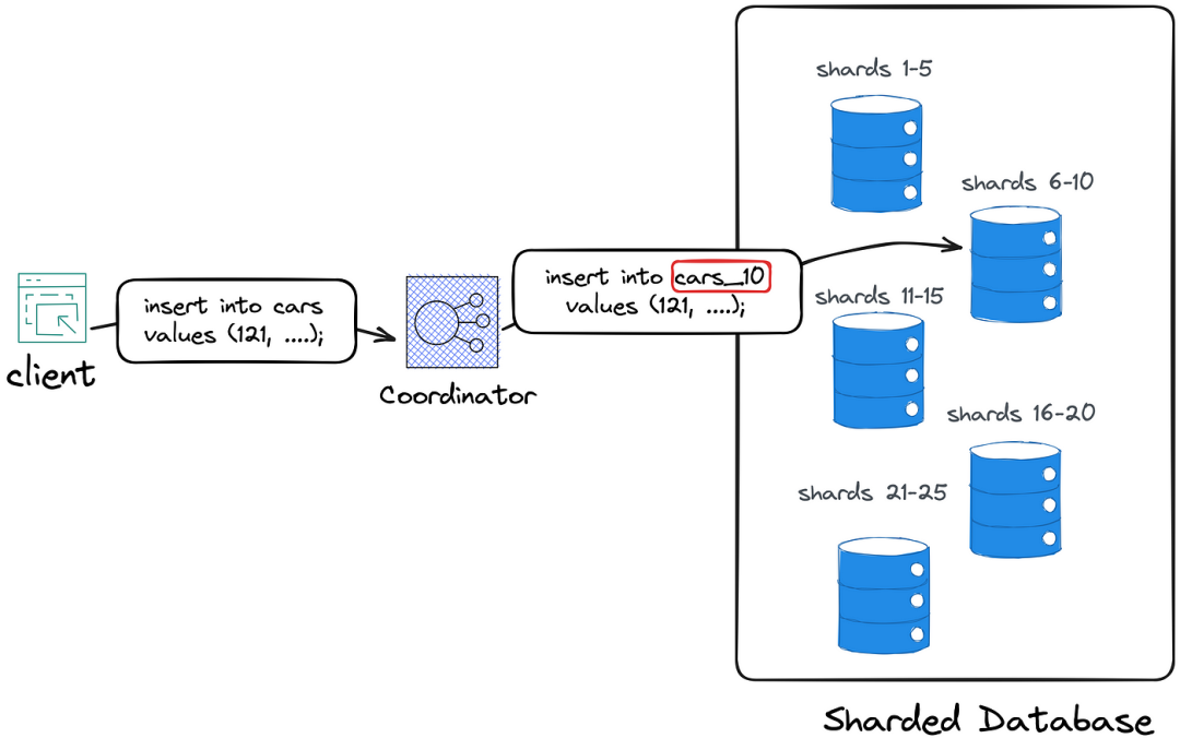 例如,并不布式如果客户端想要将新记录插入到Car表中,意味请求首先会传递到协调器。协调器将记录的主键映射到其中一个分片,然后将请求转发到负责该分片的数据库实例。