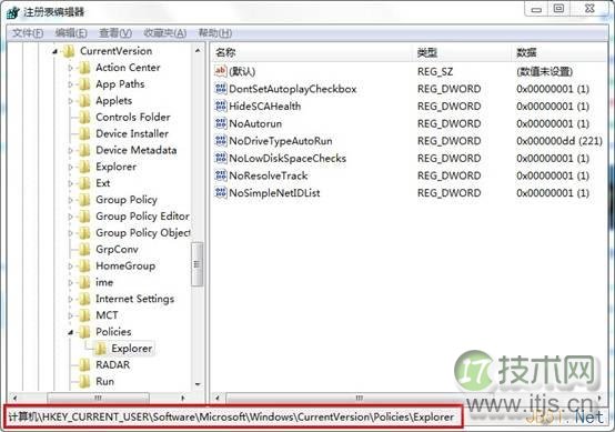 2.在打开的用注注册表编辑器中找到HKEY_CURRENT_USERSoftwareMicrosoftWindowsCurrentVersionPoliciesExplorer键值。如下图所示
