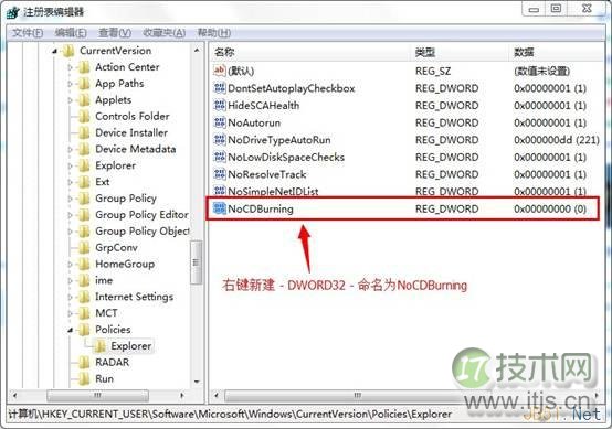 3.在右边界面空白处,册表右键新建 – DWORD32 命名为NoCDBurning。禁用如下图所示