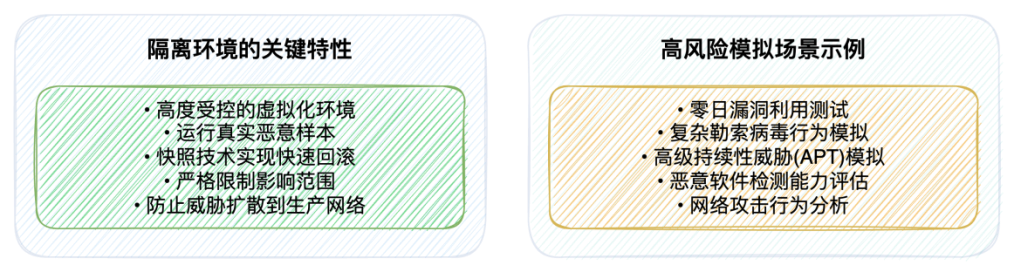 为了安全模拟一些高风险或难以在生产直接执行的攻击行为(如零日漏洞利用、复杂勒索病毒行为),利用沙箱隔离技术,实现运行真实的恶意样本,测试安全产品的检测能力,确保任何恶意行为的影响范围被严格限制,不扩散到生产网络。