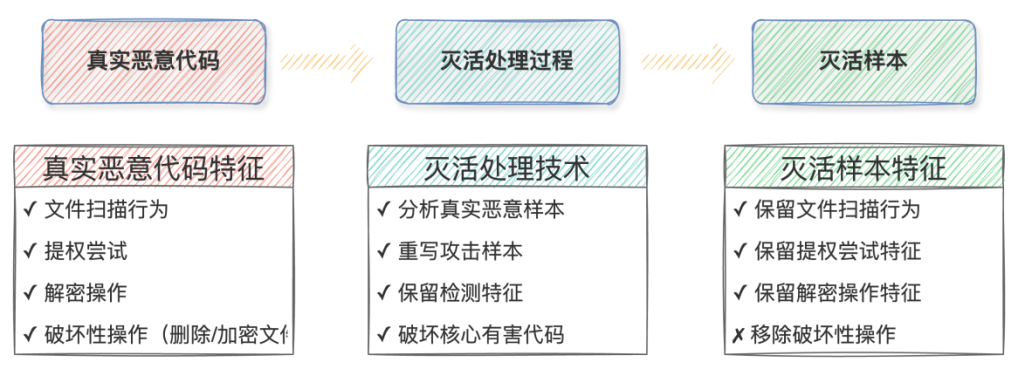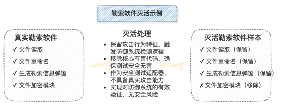 厂商通过分析真实的恶意修改样本,进行重写攻击样本处理,保留攻击行为特征(如文件扫描、提权尝试、解密等触发检测的关键模式)的同时,彻底破坏了其核心的有害代码和破坏性操作(如删除文件、加密硬盘、建立真实通信隧道等)由此产生的“灭活”病毒样本,仅作为安全测试适配器,只为触发防御系统的检测逻辑,不具备真实的攻击能力。
