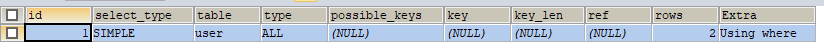 复制select * from user where age=21; select * from user where name=Kevin; select * from user where age=21 and 匹配name=Kevin;1.2.3.我们通过 EXPLAIN加上面的任意语句执行,会看到type值为all。个例