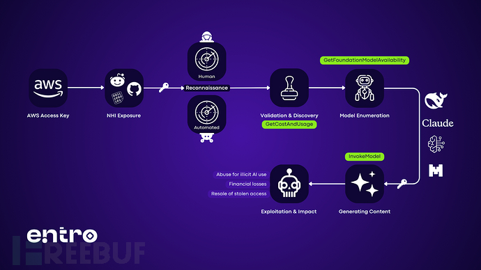 (4) 利用:攻击者对受损端点进行自动化的InvokeModel尝试,研究人员在实验密钥中观察到每小时超过1200次未经授权的推理尝试。