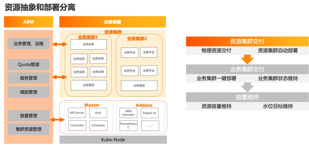 Hologres 是完全基于云原生的方式设计和实现的,通过存储计算分离的方式,解耦了计算资源和存储资源;其中计算节点的部署通过K8s集群进行部署和拉起。通过自研的运维管理系统ABM,在集群交付上,我们对集群进行抽象设计,分离出资源集群和业务集群的概念;资源集群的交付,ABM和底层平台进行打通,进行资源集群的创建和容量维持;在业务集群上,ABM提供基于K8s 概念的部署模板,将管控等节点在资源集群上快速拉起,完成交付。