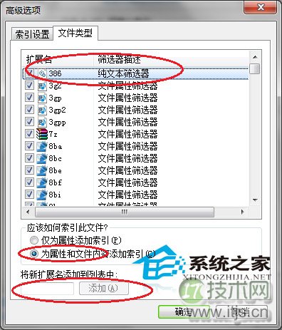 3、打开“控制面板”,选择“大类别”或“小类别”,然后打开 “索引选项”。点击“高级”按钮,在弹出的对话框中打开“文件类型”标签,企商汇在下方的输入框中“将新扩展名添加到列表中”,添加要搜索的未知文本文件的扩展名。添加后,在上方的扩展名列表里会出现,找到后点击选中,然后选择“为属性和文件内容添加索引”,再点“确定”。关闭对话框,大功告成啦!