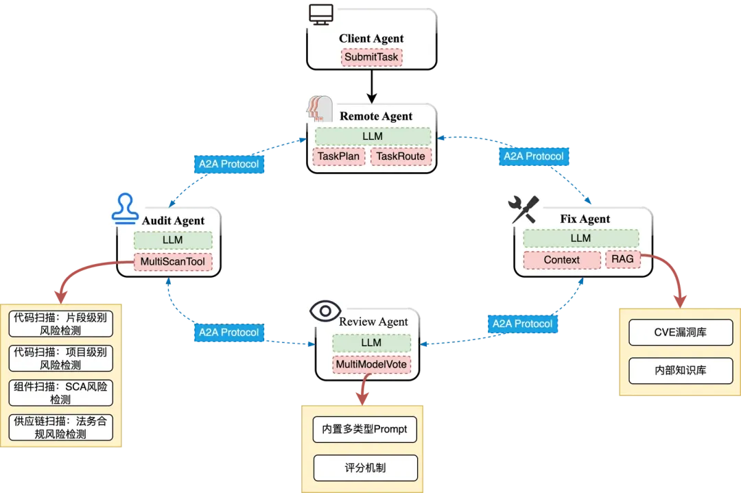 (1) 任务接收与分解: 用户通过Client Agent 提交任务。该任务首先到达“产线总指挥”—— Remote Agent 。它利用大语言模型(LLM)进行任务规划,将复杂需求智能分解为独立的子任务(如代码审计、结果验证、修复方案生成)。