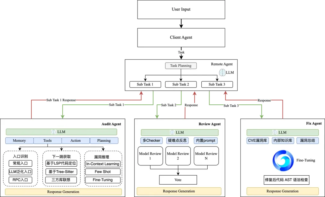 Audit Agent 运用LLM和代码分析模块(如入口识别、上下文获取、漏洞推理)执行深度扫描。Review Agent 利用LLM及多重校验、投票机制(如多Checker、疑难点反思)确保结果准确性。Fix Agent 参考知识库(CVE库、内部库),借助LLM微调生成修复建议并进行语法检查。(3) 结果汇总输出: 各智能体完成工作后,将处理响应反馈给Remote Agent 。由它负责整合所有子任务的结果,形成一份完整的、经过层层处理的最终报告或解决方案,并准备交付。