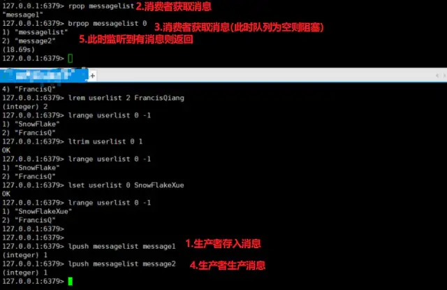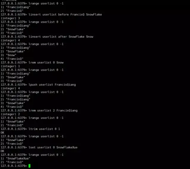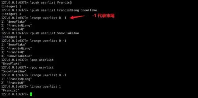 lpush key item1 item2 item3… 从左入栈rpush key item1 item2 item3… 从右入栈lpop key 从左出栈rpop key 从右出栈lindex key index 获取指定索引的元素 O(n)谨慎使用lrange key start end 获取指定范围的元素 O(n)谨慎使用