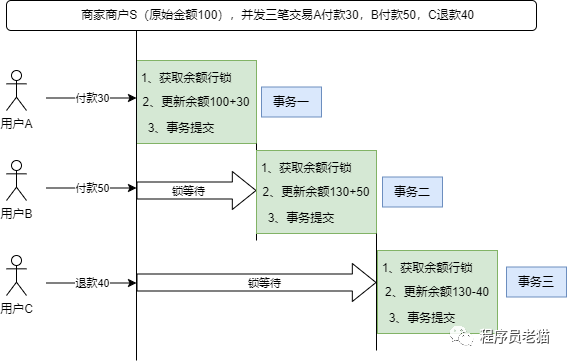 我们来看一下热点商家账户S的例子,可能更容易让人理解。大量请求并发打到我们数据库底层表的时候,底层账户S究竟发生了什么。假设我们现在有用户A、用户B、用户C,等等可能更多,另外有一个商家账户S,我们暂时枚举三个,站群服务器那么当其同时并发打到底层数据库的时候,就有如下图所示。
