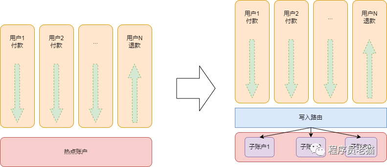 优点:化多次账户余额更新操作为一次,减少了数据库的读写操作。缺点:由于是异步进行,交易其实并不能实时入账,如果是减频账户场景的话,也还是会有账户透支风险。适用:非常适用加频热点账户,对于减频账户以及双频账户慎用。6.账户拆分记账既然单个账户写入的时候压力过大,那么我们就将单个热点账户拆分成多个子账户去分散每个账户的读写压力。