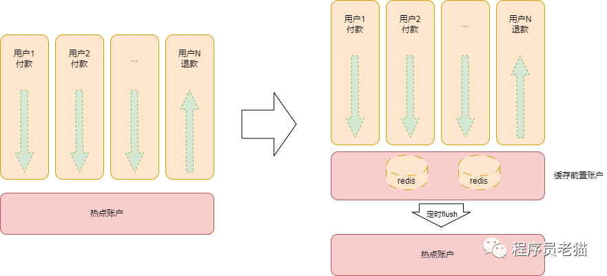 优点:分散了单个热点账户的写入量。缺点:子账户扣款的时候余额扣款处理需要做资金归集,可能出现扣款失败,但是如果归集做的好,那么其实问题也不大。适用:这种方案适用于所有类型的热点账户类型。7.缓存记账Mysql的读写能力不好,那么我们就去寻找比Mysql读写效率更高的中间件,将结果预先计算好,那么我们很容易就想到了用非关系型数据库作为前置账户,比如redis,让计算结果先在redis中计算完成,然后最终异步flush到mysql中。