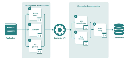 这种类型的安全措施都内置于应用本身或者了解应用正在访问的资源,由于它们有那些正在尝试执行操作的用户,操作本身以及操作的资源相关的全部上下文,因此认为它们都是“细粒度”的,包括应用/API授权,数据过滤和数据代理。随着粗粒度解决方案日趋成熟,目前许多创新都转向了细粒度授权,其中的大多数解决方案都要某种程度地集成到应用程序中,而不仅仅是网络级别拦截请求。