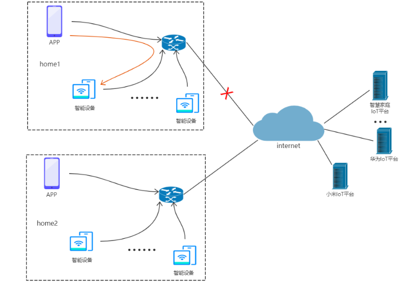 Part 03 本地化组网我们一般的家庭网络如下图1所示,智能设备和手机APP通过Internet连接到IoT平台,其管控也完全依赖Internet,其外部网络中断,那所有家庭智能设备也就失控了。